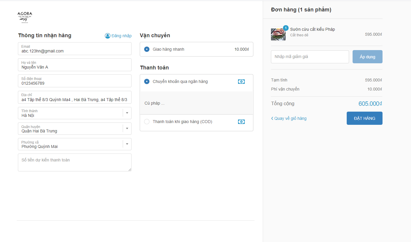 Bước 4: Điền các thông tin của bạn để nhận đơn hàng, lựa chọn hình thức thanh toán và vận chuyển cho đơn hàng của mình